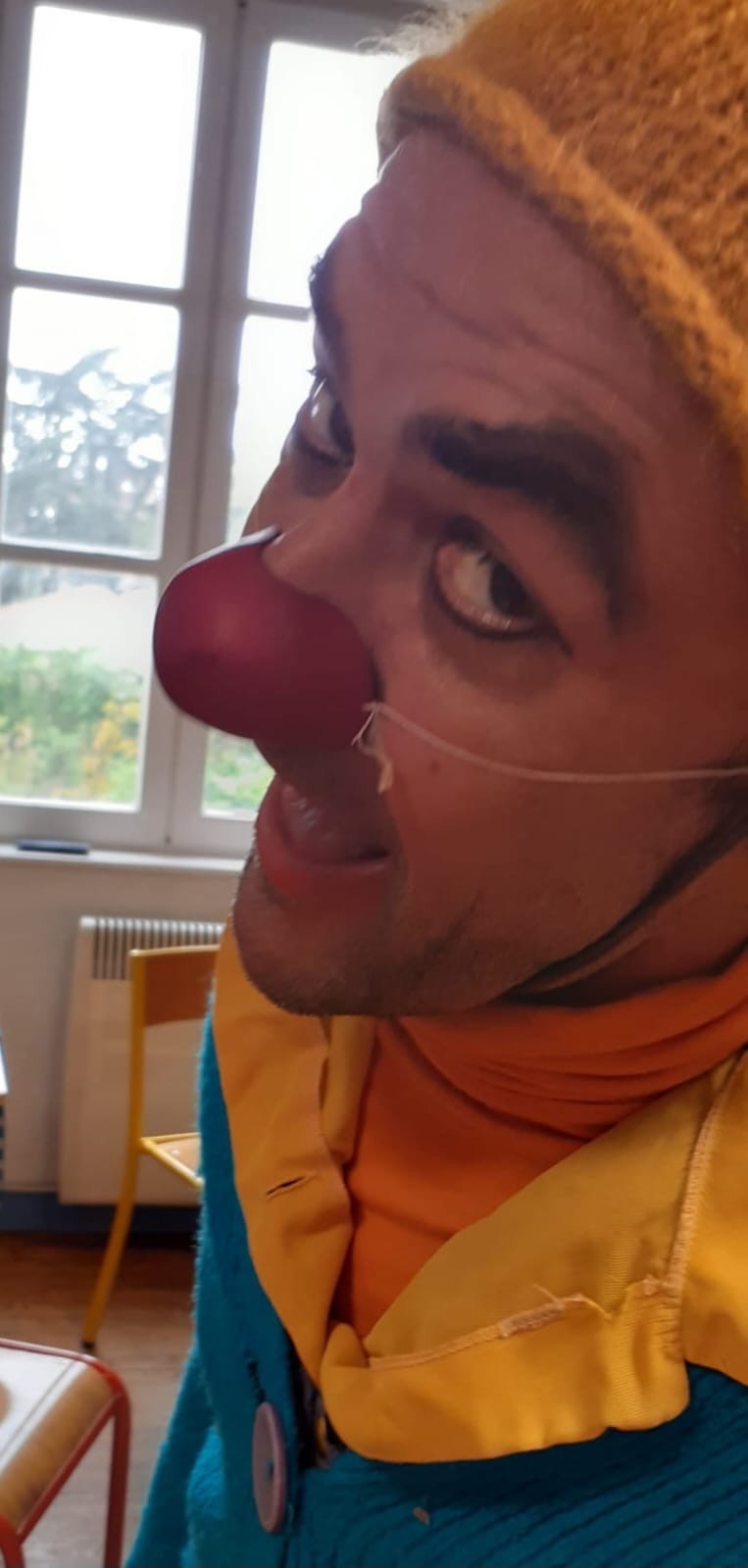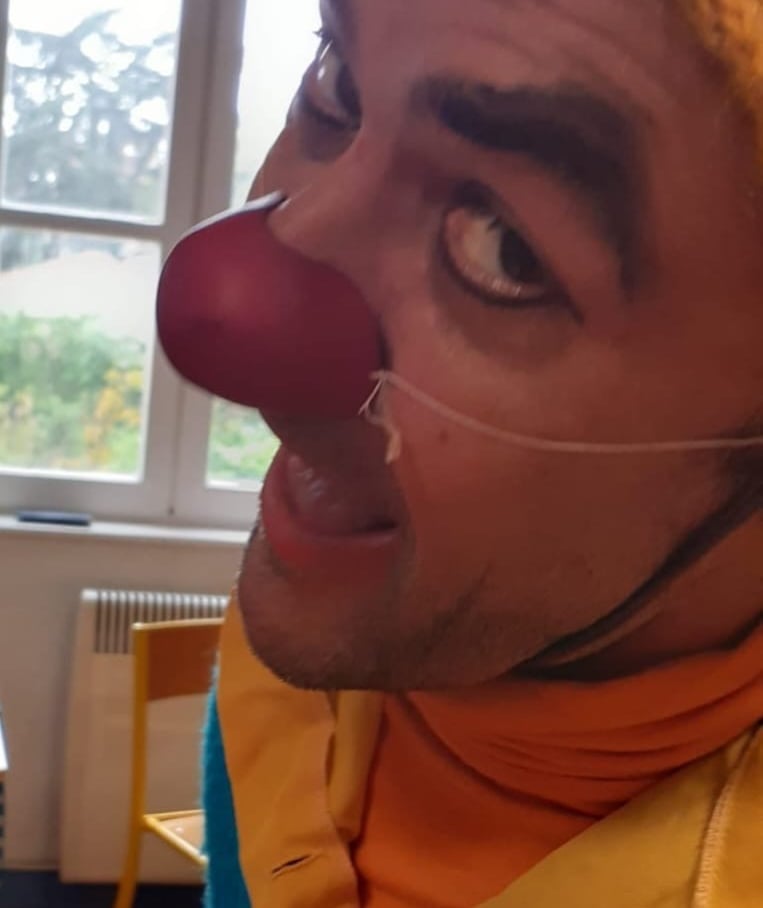 Et puis on me demandait ce que je voulais faire quand je serai grand ? Je répondais : Bah... Être clown !? Et vous ?Donc, l’université en licence « arts du spectacle », puis master « médiation culturelle de l'art », où j’ai créé des spectacles avec les copines et les copains dans tous les sens, également en colonies de vacances avec plein d'enfants et de personnes en situation de handicap. Bref, des lectures et des spectacles... toujours, tous les jours, de l’art vivant ! Et puis enfin, la formation « La poissonnerie » à l’Arche de Saint Antoine l’Abbaye en 2015 avec Albert Solal, Sandrine et Gilbert où mon clown est né. Avec « ARClown, Arts Clowns Rire et Compagnie », je suis ensuite devenu animateur du stage clown 1 et du yoga du rire. Et beaucoup d’autres stages de clown aussi. Une lente et profonde transformation... Avec le temps, je me rends compte combien cette petite boule rouge que l’on met sur son nez m'a sauvé la vie. Cela m’a permis de grandir, de m’assumer tel que je suis avec mes joies, mes peurs, mes folies, mes maladresses... Cela m’a amené vers le chemin de l’existence vraie, le chemin de la simplicité, d’aimer être là, au présent... Je passe mon temps à jouer, jouer, jouer, de plus en plus avec ma timidité, mes émotions en ébullition, ma bulle en exposition. Jusqu’à créer mon premier solo, l’histoire d’une tête d’ampoule.
